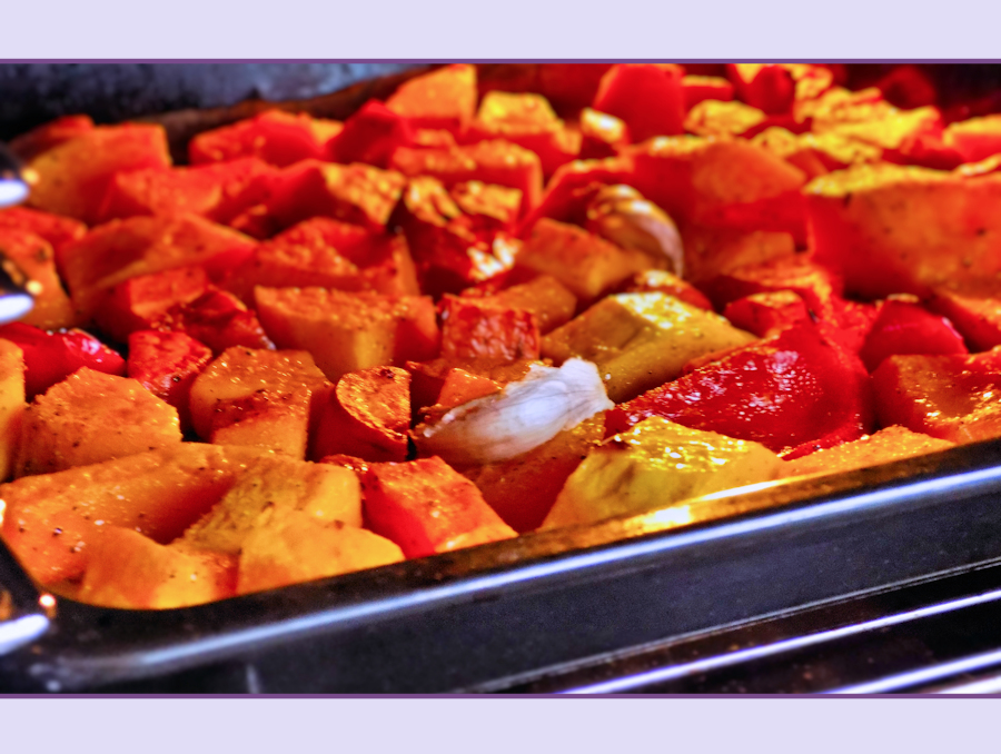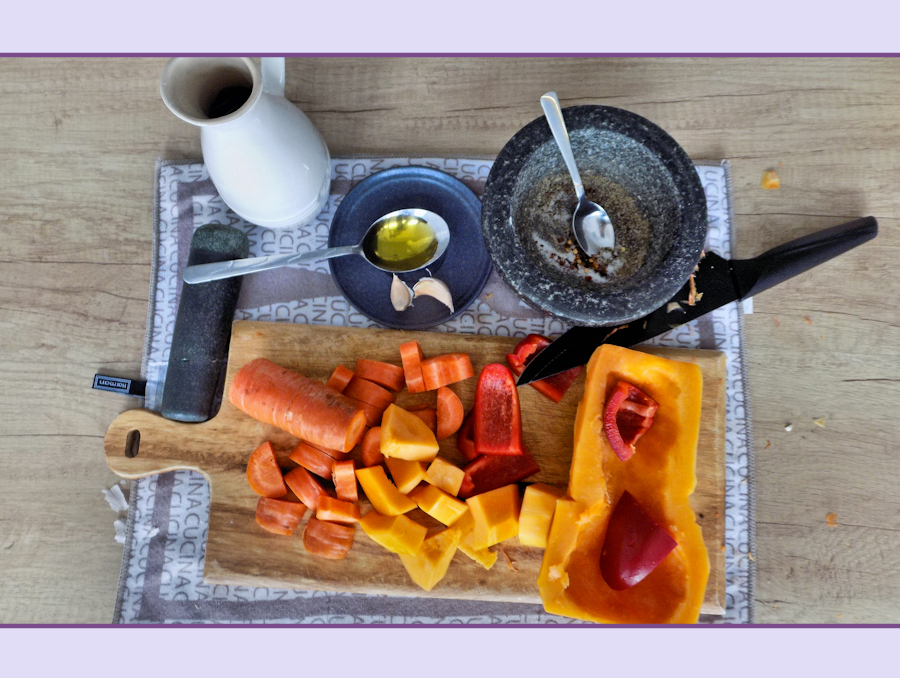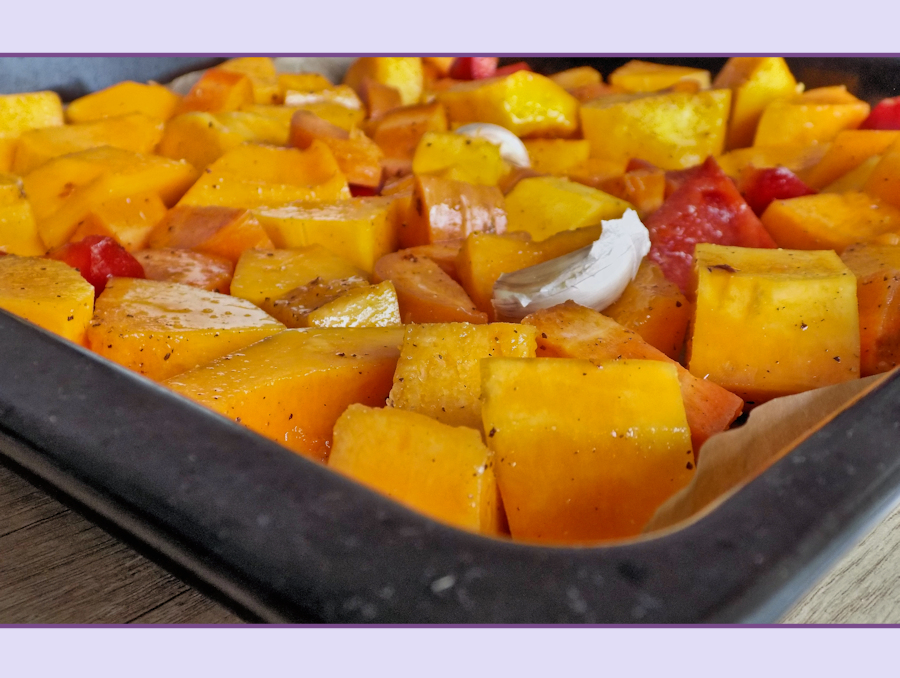 1kg squash, ½ red pepper (about 110g), 2 carrots (about 250g), ½ tsp chilli flakes, ½ tsp salt, ½ tsp pepper, 2 crushed garlic cloves, 4 tbsp olive oil.