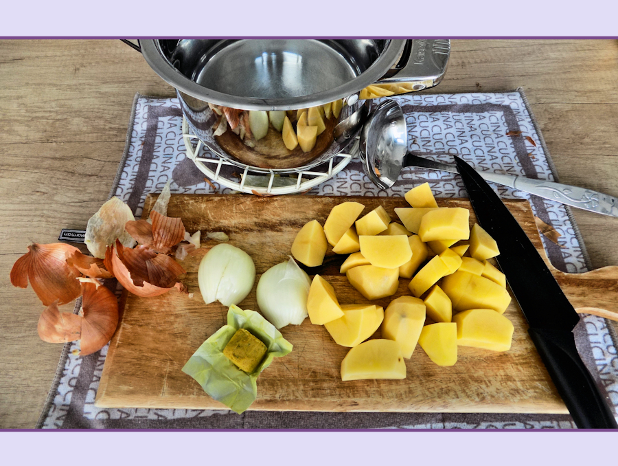 2 liters of water, 3-4 potatoes (about 400g), 1 onion, 1 cube of good quality chicken stock, (season to taste) salt and fresh ground black pepper.
