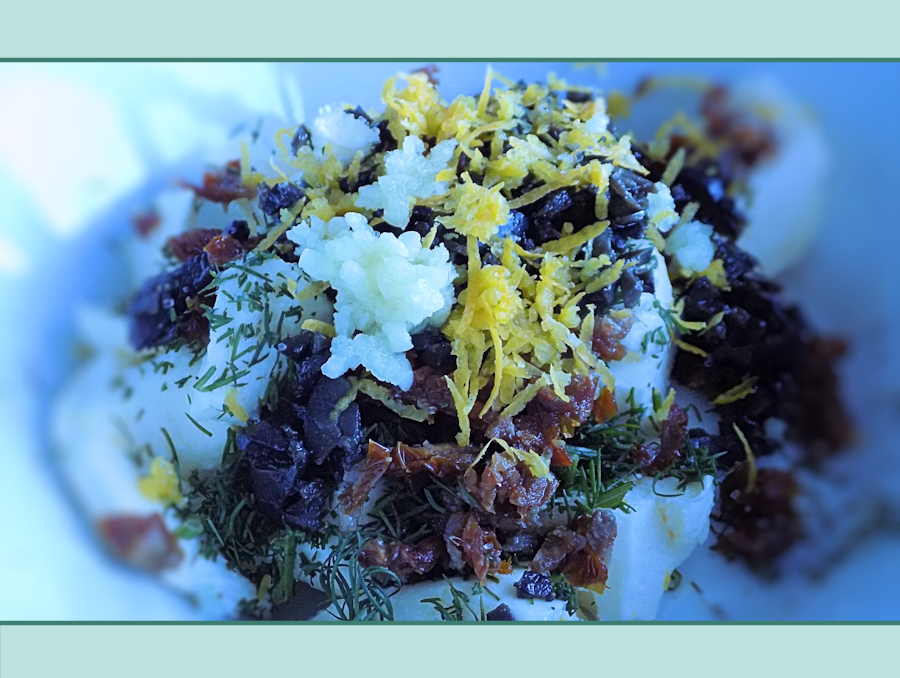 1 garlic clove (crashed using a garlic press), 70g butter, 1 tbsp chopped fresh dill, 2-3 black olives (very finely chopped), 1 anchovy fillet in oil & 1 sun-dried tomato in oil (drained and finely chopped), finely grated rind of ½ lemon, Salt and pepper to taste.