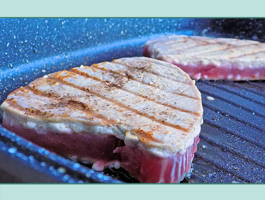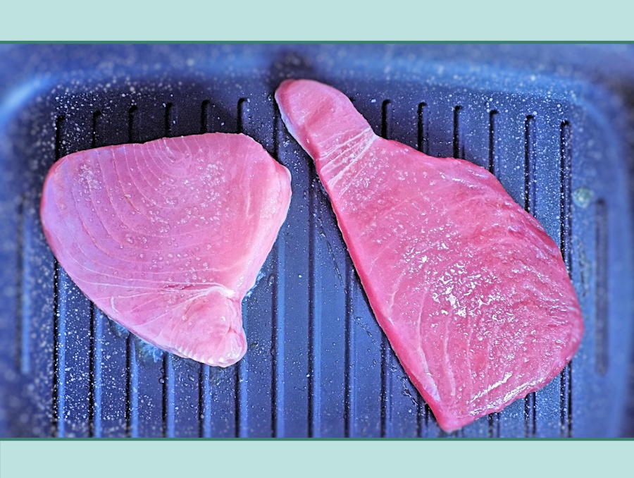 - Heat a large griddle pan over high heat. Brush the tuna with oil and season with salt and pepper on both sides. Place the tuna steaks in the pan and griddle for 2-3 minutes. Brush the tuna with a little more oil, turn the steak over, and continue cooking for another 2-3 minutes.