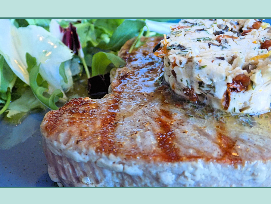 - Transfer the tuna steaks to plates and top each with a slice of the chilled butter. Serve immediately, accompanied by mixed salad leaves.