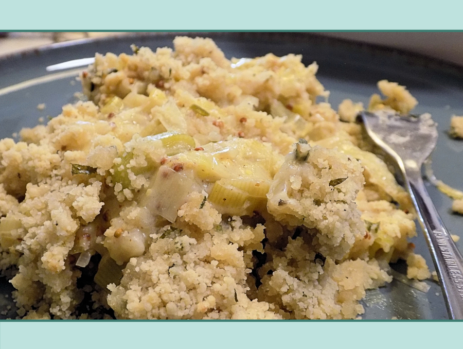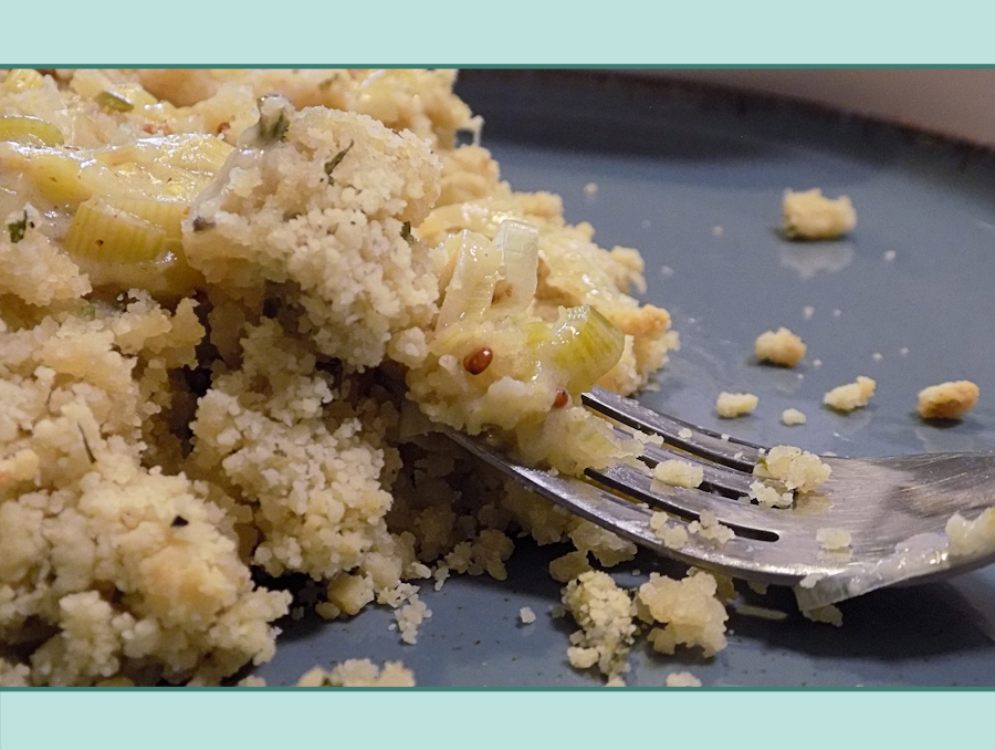 - Bake in the preheated oven for 25 minutes or until the crumble is golden brown, and the leeks are bubbling up from the bottom.