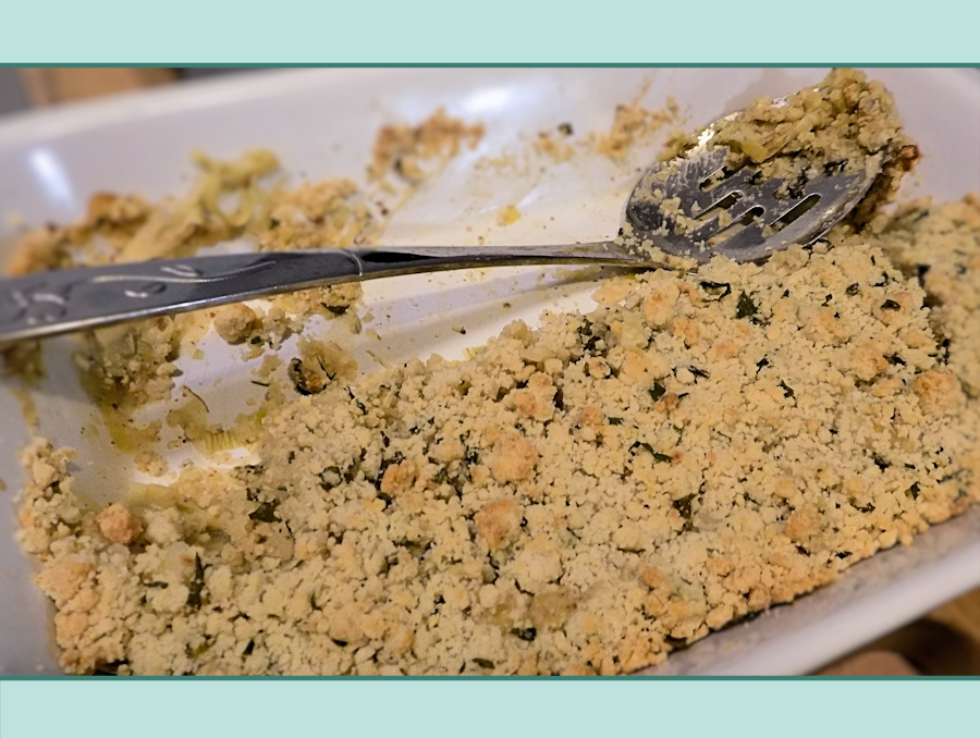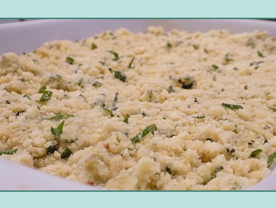 - Liberally sprinkle the crumb mixture on top of the creamy leek mixture and press it down gently.