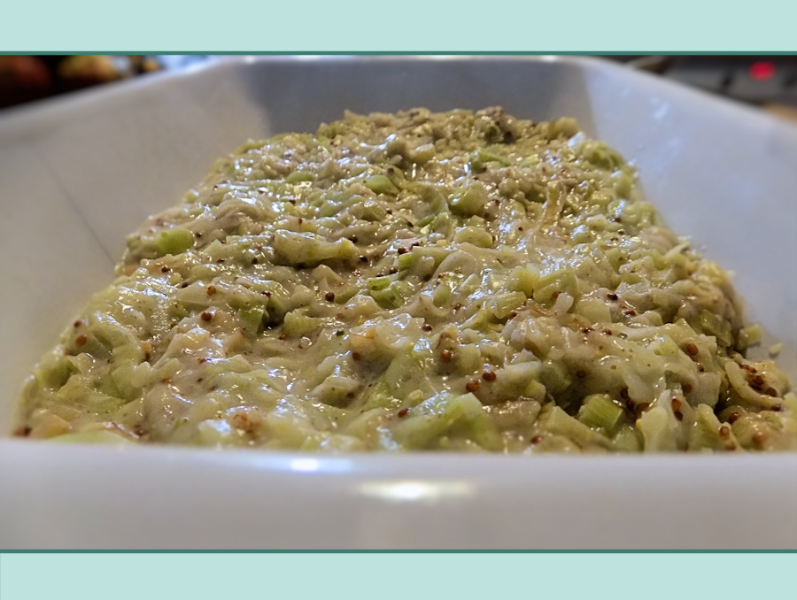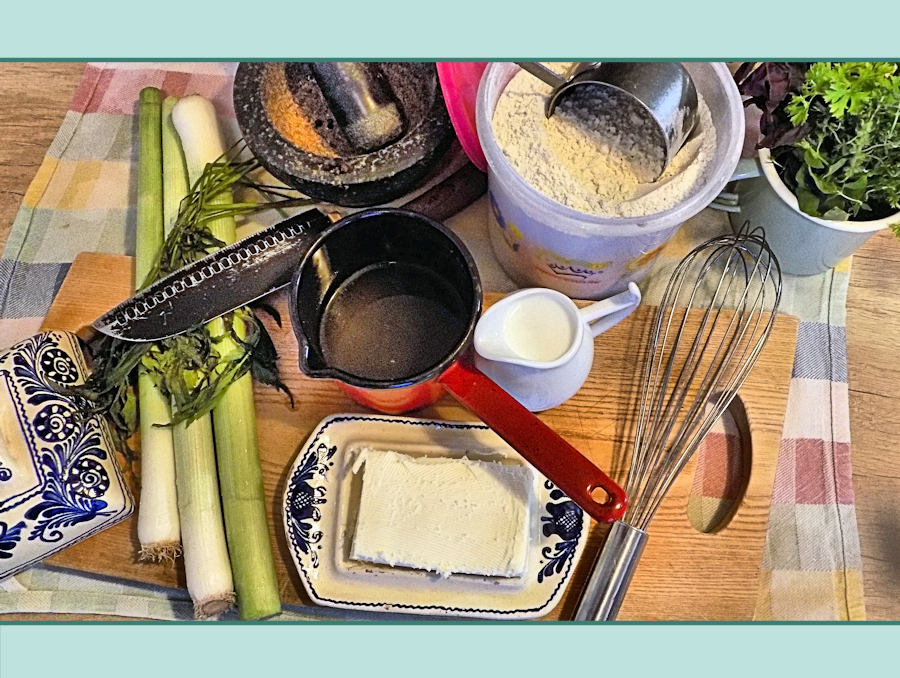 - Transfer the creamy leek mixture into a large ovenproof dish (1.5 liters) and set it aside to cool slightly.