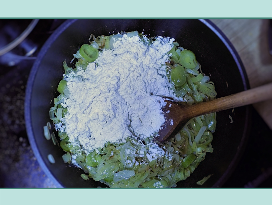- Add the flour to the leeks and stir until it has almost disappeared. Pour in the stock, milk, and mustard. Season with salt and freshly ground black pepper, then simmer gently for 5 minutes.