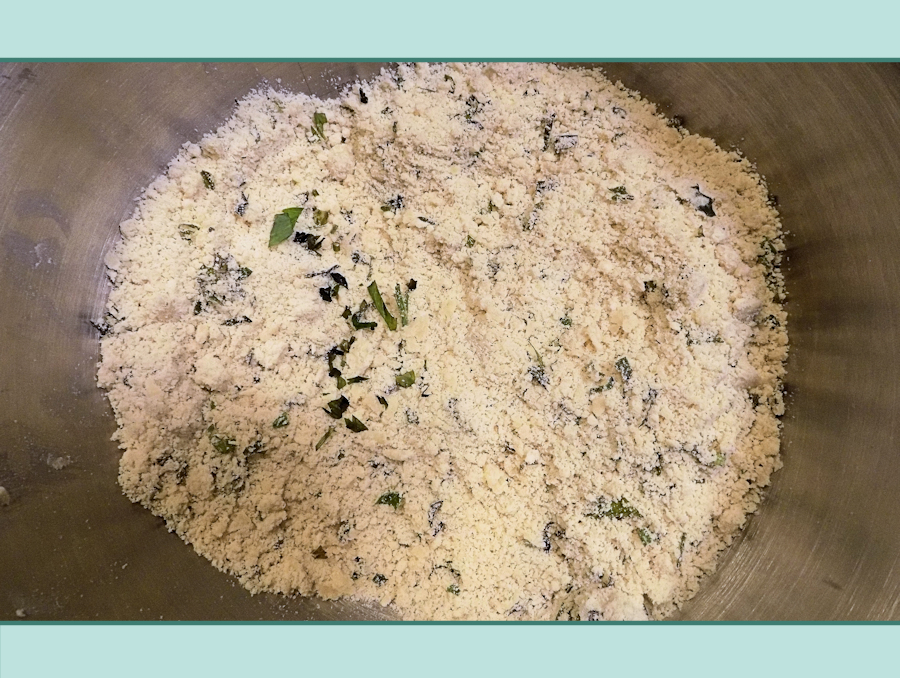 - Rub the softened butter into the flour until the mixture resembles fine breadcrumbs. Use your hands for this task, as they work best. Add the chopped herbs and grated cheese. Mix thoroughly to create small clusters of crumble mix. Use your hands to clump the mixture together a little, adding a few drops of water if needed.