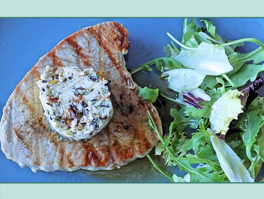 - Transfer the tuna steaks to plates and top each with a slice of the chilled butter. Serve immediately, accompanied by mixed salad leaves.